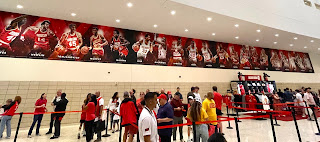 Next I went to the top floor mainly to grab photos of the rafter banners, the retired jerseys, and a picture of the center court logo. But was pleasantly surprised to see all sorts of fan interasction places for kids and adults. The area where you can try to out jump a player to grab a ball, compare height with stars, and how wide is your arm span compared to Yao Ming. They had a mock locker room and a mini basketball court for the kiddos as well. The other cool area was the original center court from 20 years ago with plexi glass on top as well as another more realistic mock locker room of some of the more famous Houston Rockets over the years. For some reason the area was blocked off but I still got a good view and shots of the area.